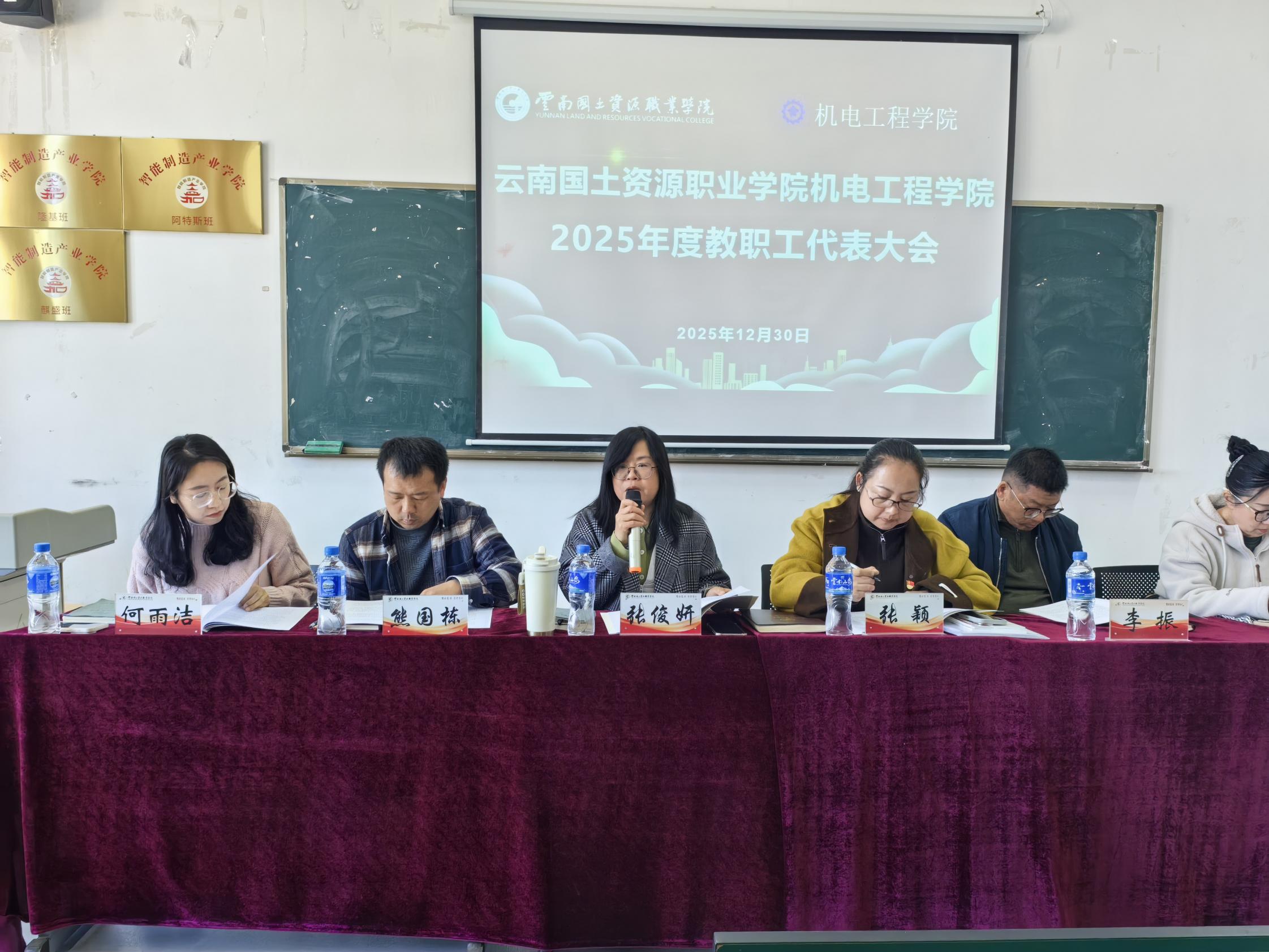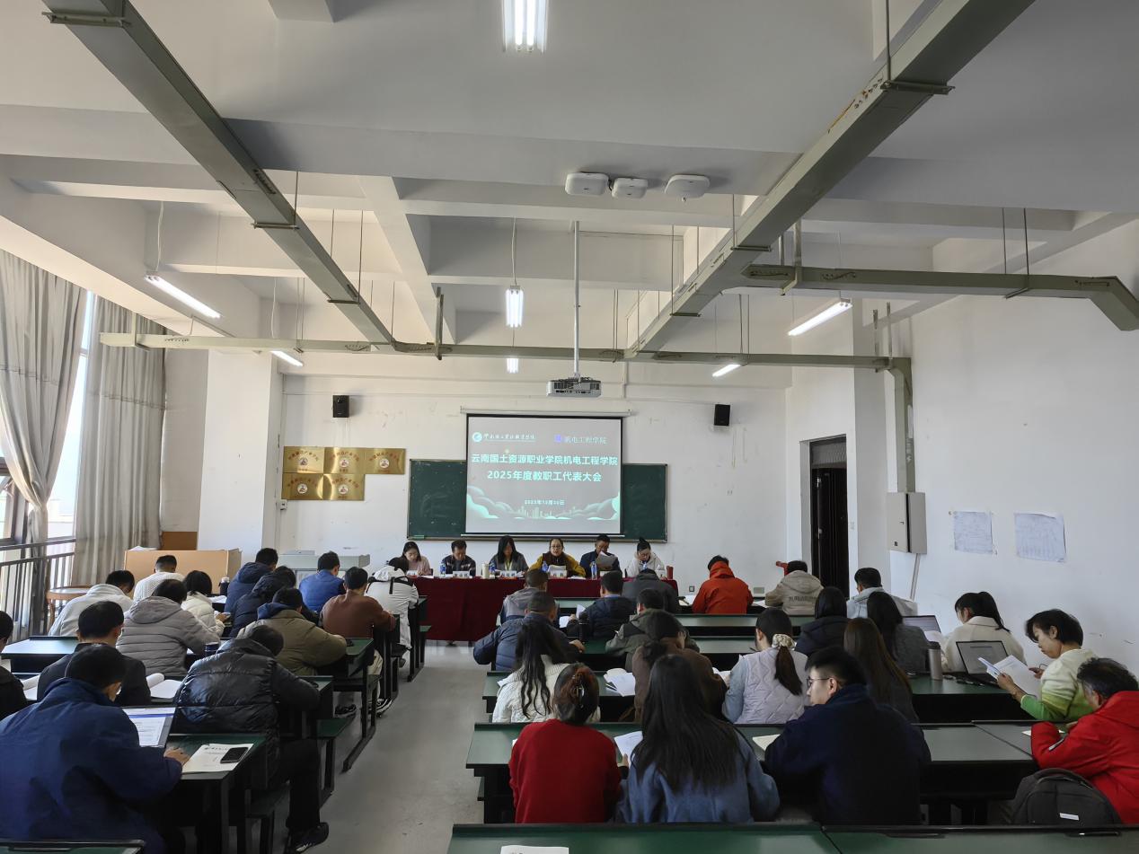12月30日,云南国土资源职业学院机电工程学院2025年度教职工代表大会在明尚楼A216召开。本次大会由机电工程学院党委书记张颖主持,学院全体教职工参加。