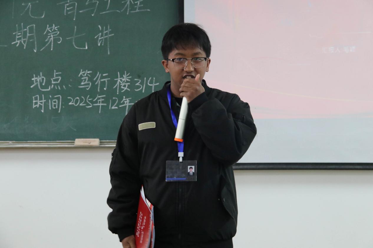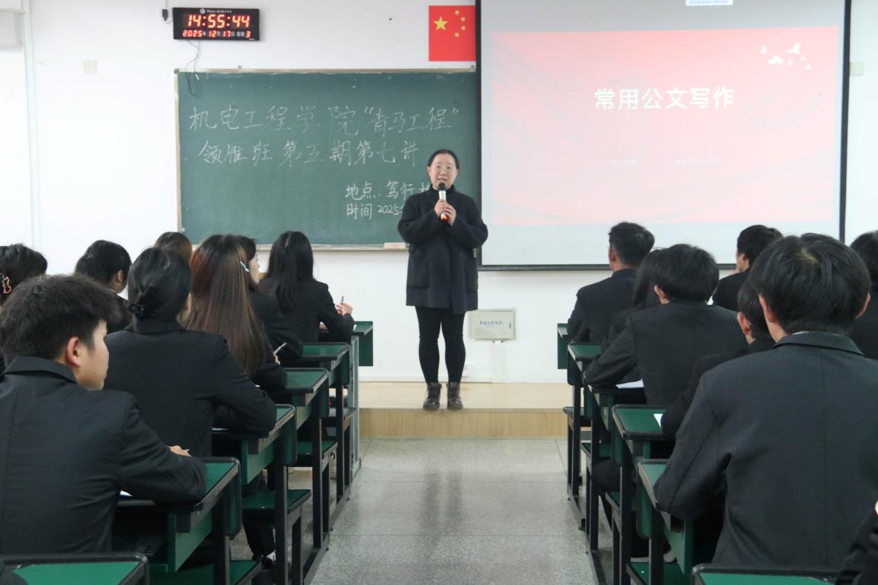 为提升青马学员的公文写作能力,12月17日,机电工程学院“青马工程”领雁班第五期第七讲在笃行楼314教室举行。本次培训由学院学工办主任毛颖老师主讲,团总支副书记普廷云主持,领雁班第五期全体学员参加。