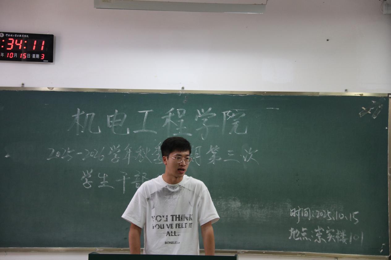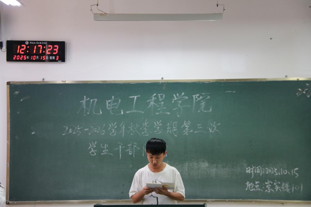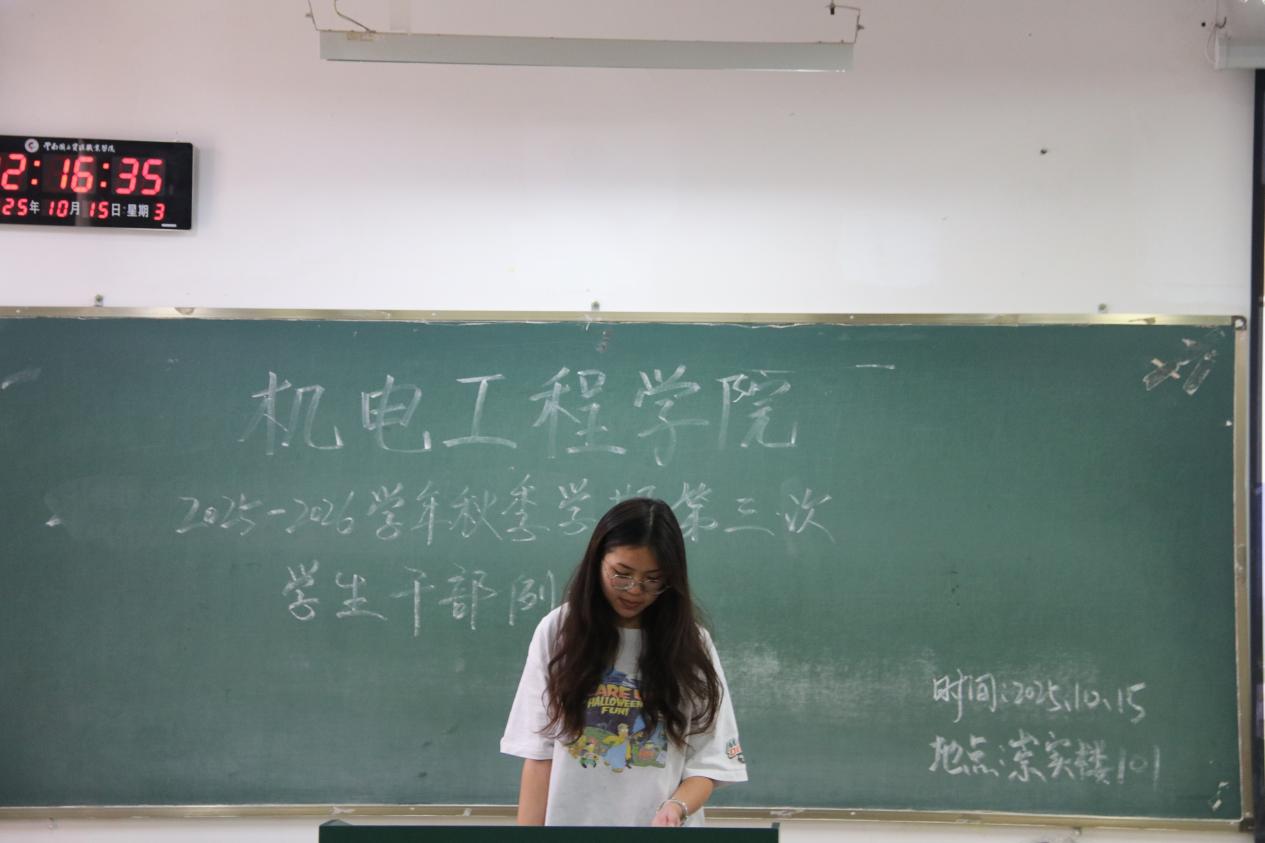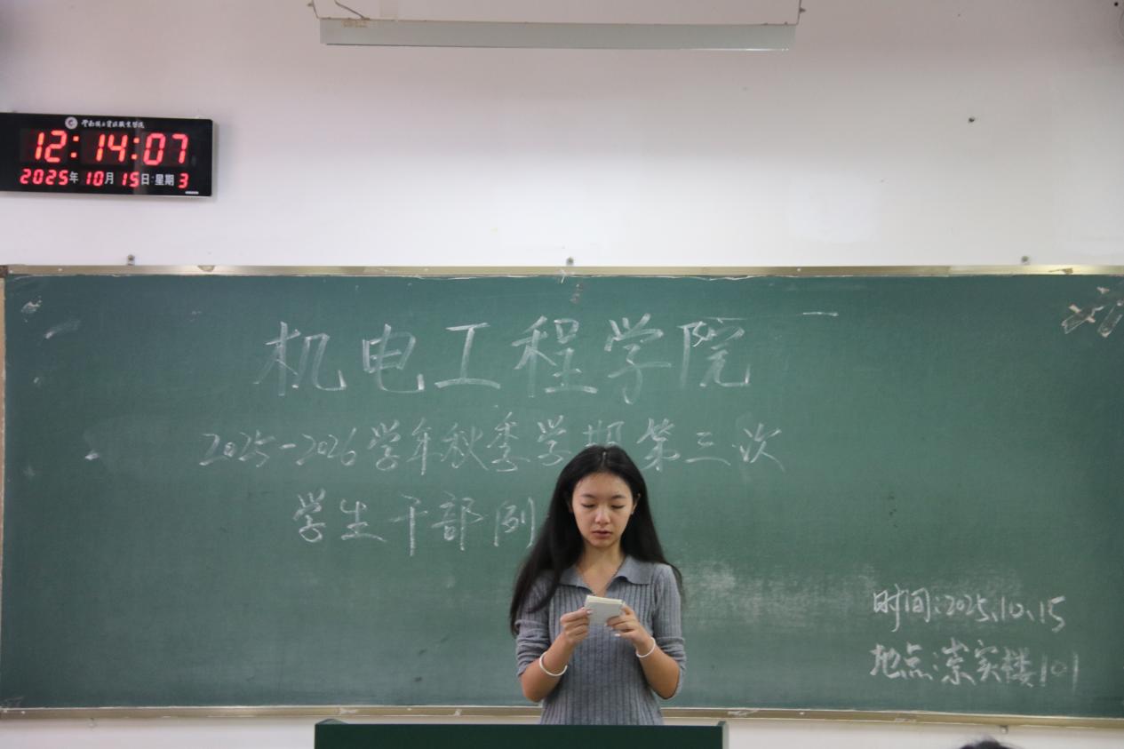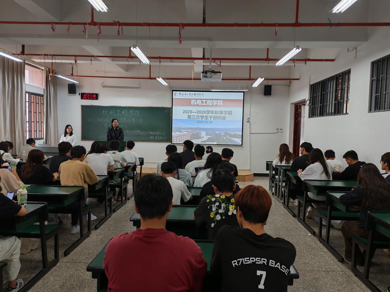 为统筹推进秋季学期学生工作,机电工程学院于10月15日召开本学期第三次学生干部例会。团学工作者杨珍妹老师、胡见平老师及全体学生干部参加会议。
