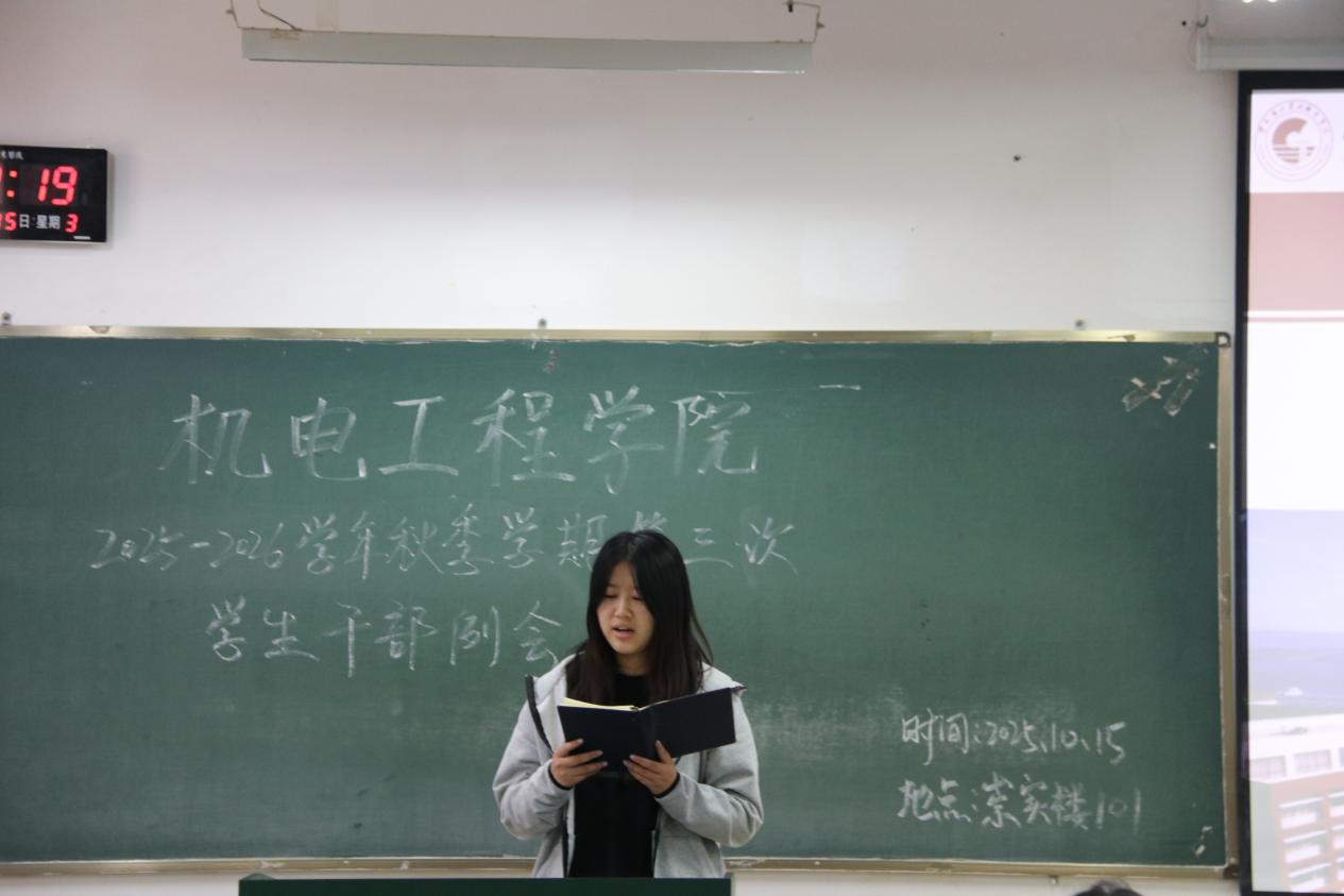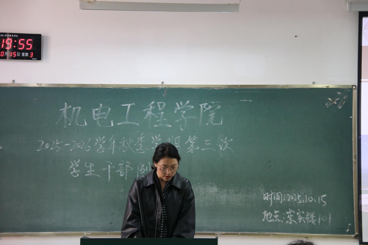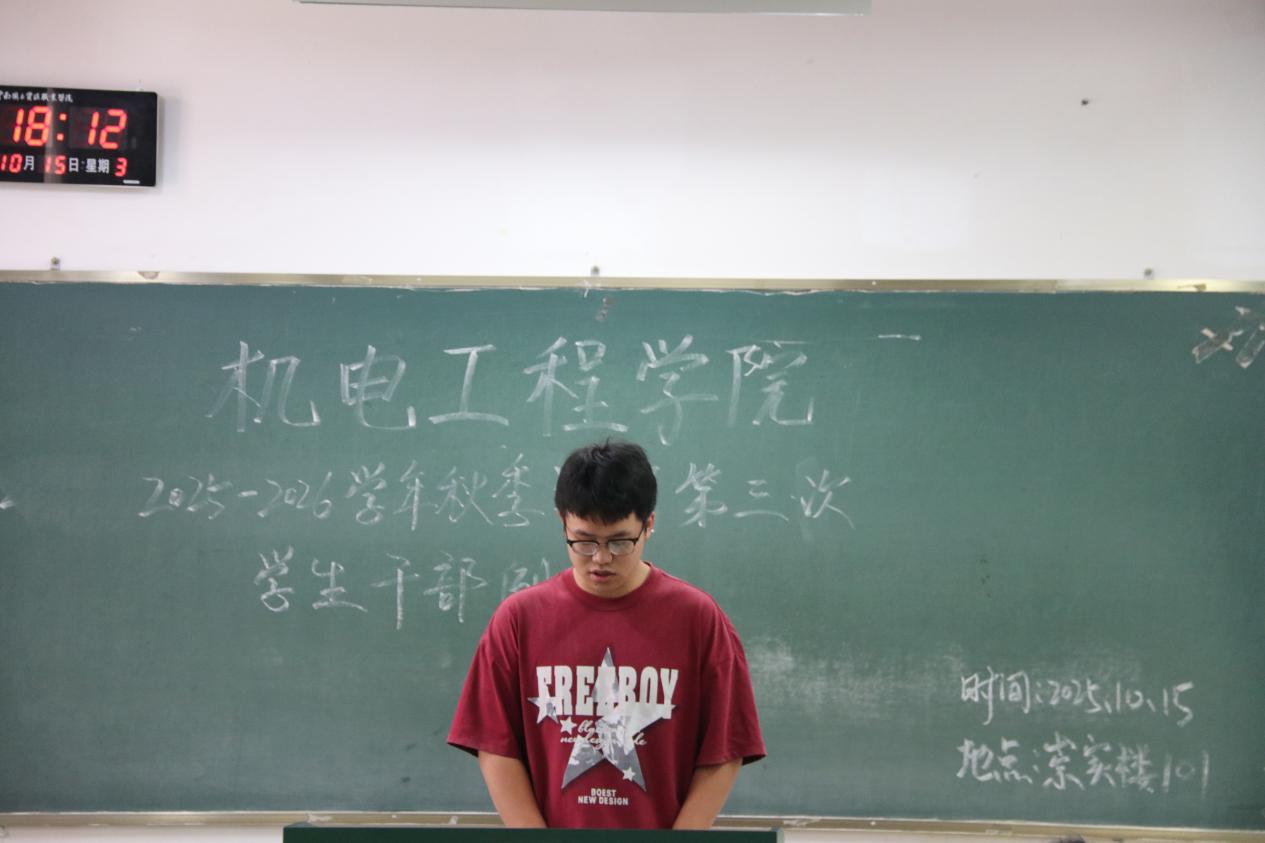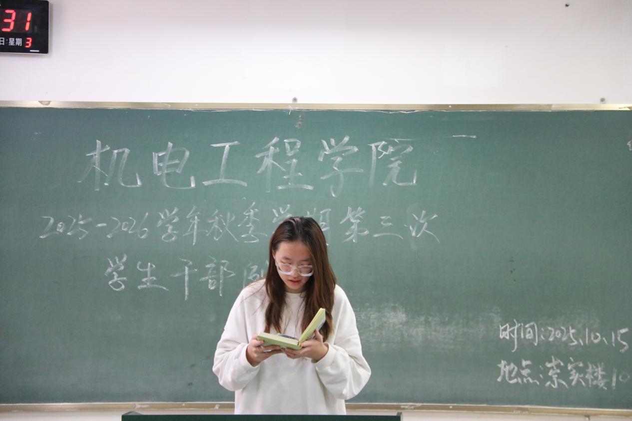 为统筹推进秋季学期学生工作,机电工程学院于10月15日召开本学期第三次学生干部例会。团学工作者杨珍妹老师、胡见平老师及全体学生干部参加会议。