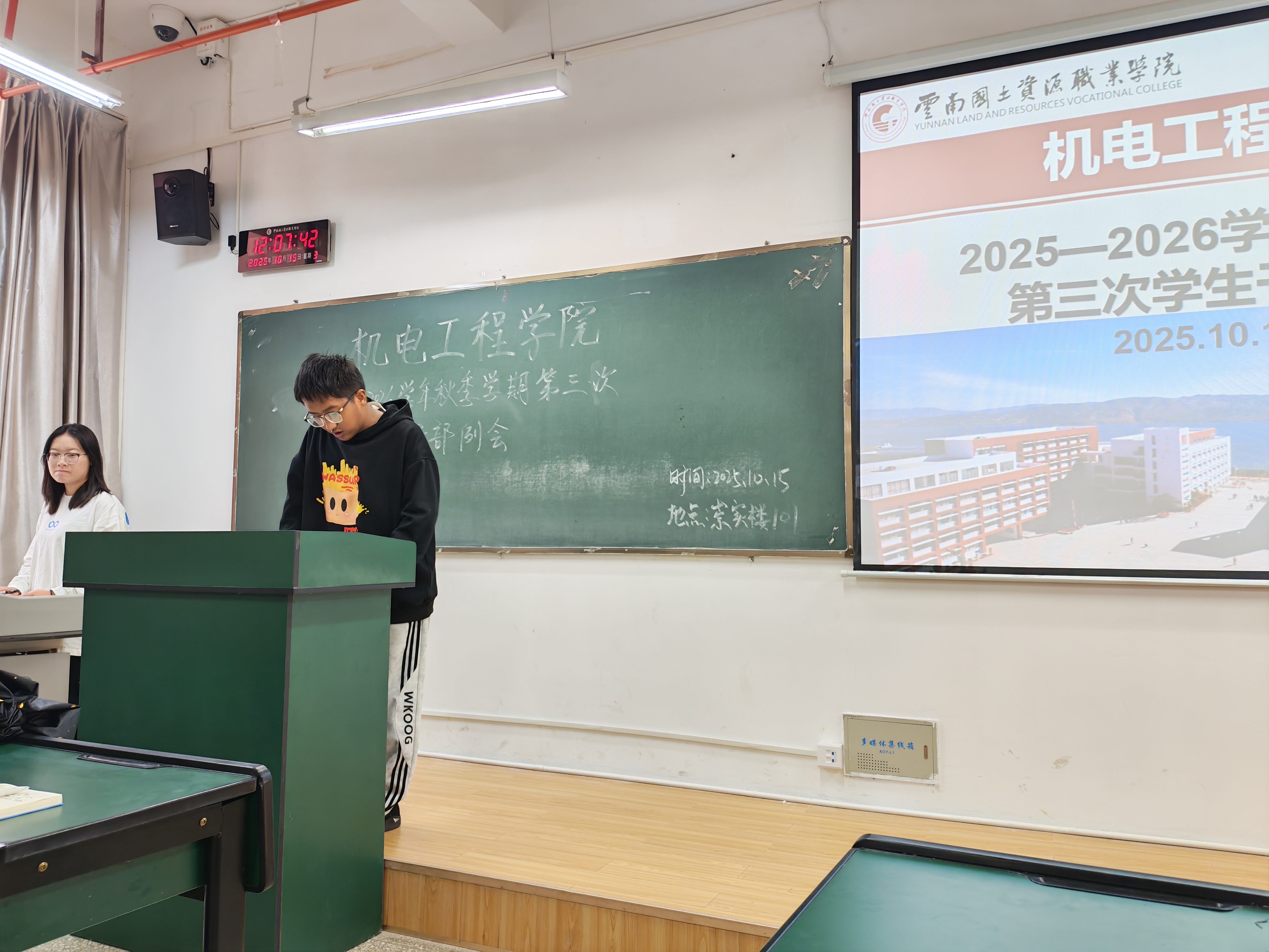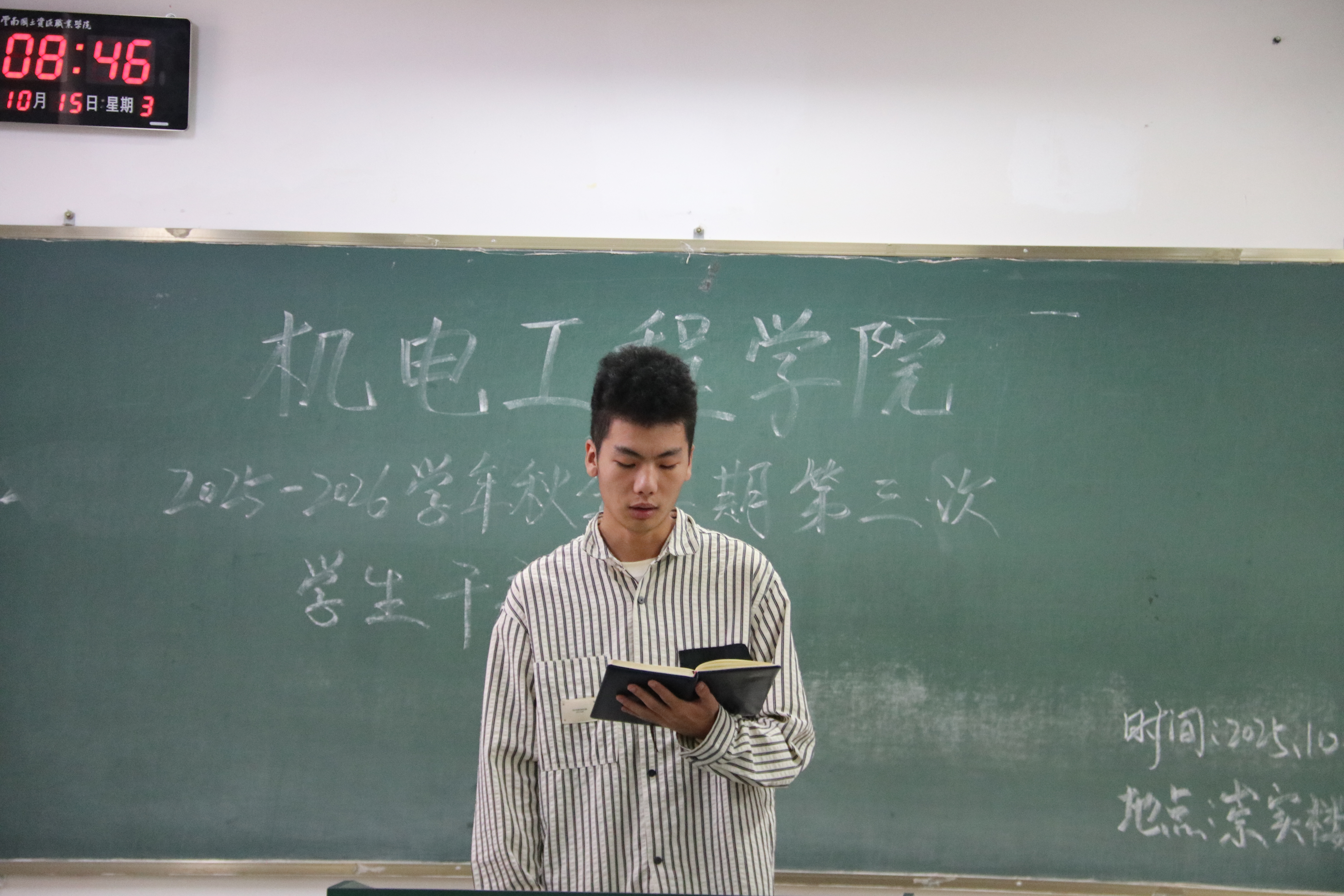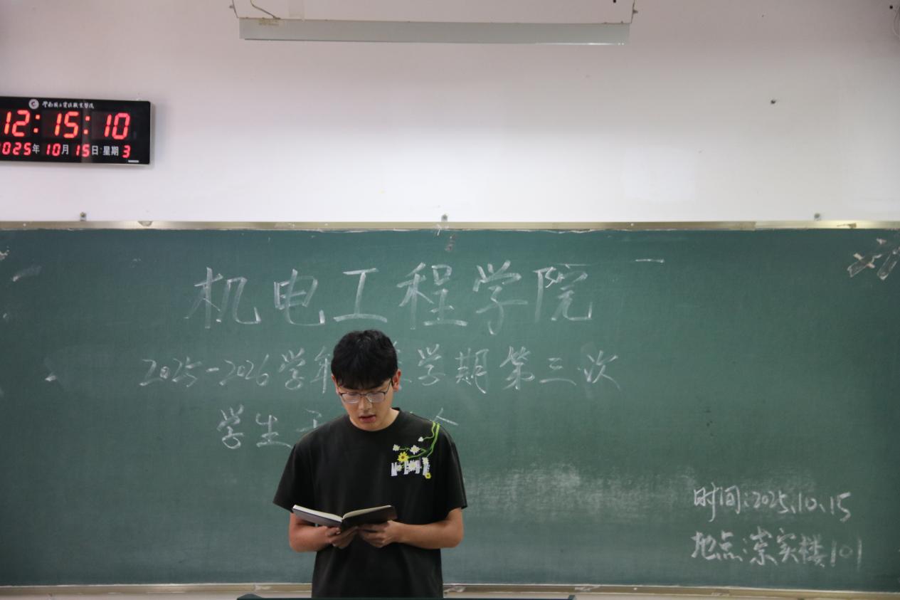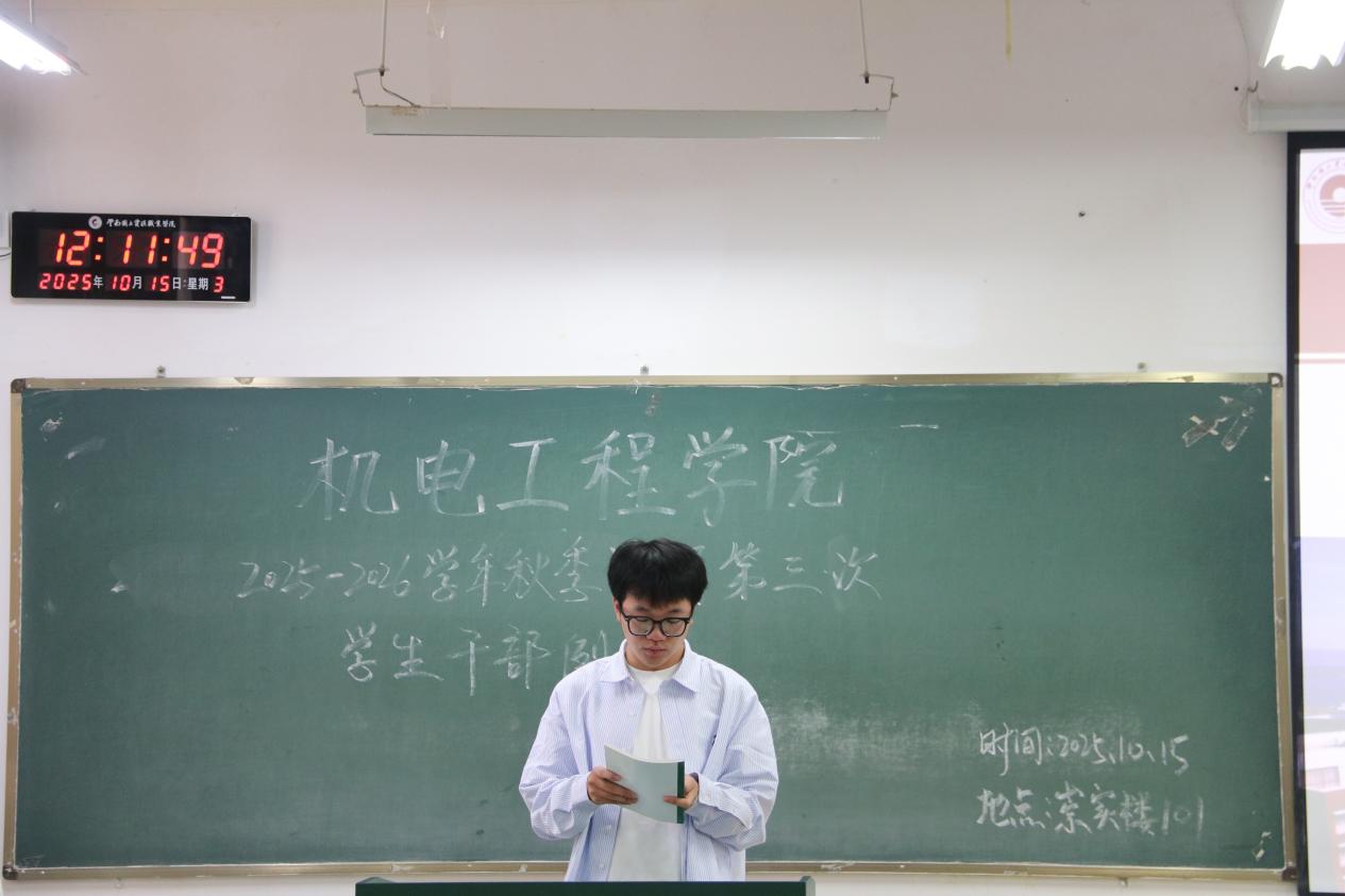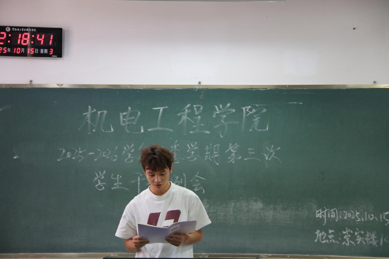 为统筹推进秋季学期学生工作,机电工程学院于10月15日召开本学期第三次学生干部例会。团学工作者杨珍妹老师、胡见平老师及全体学生干部参加会议。