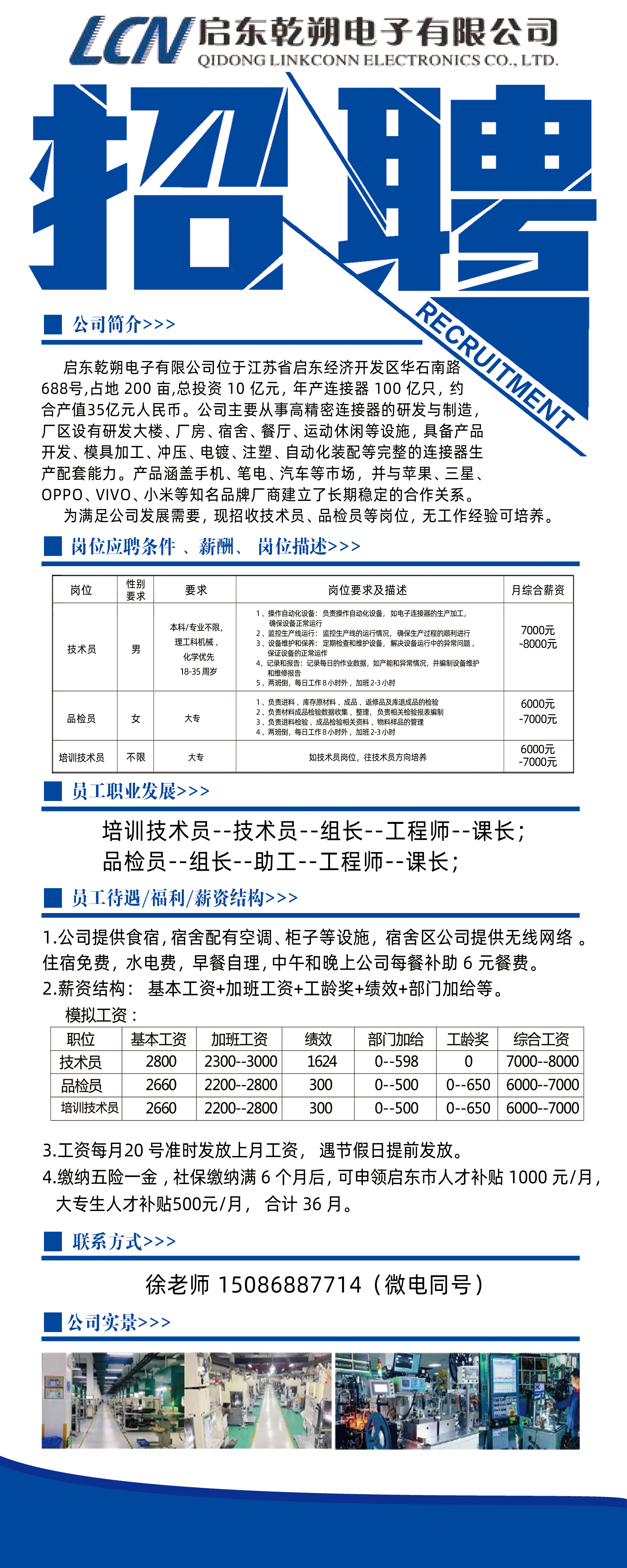 为满足公司发展需要, 现招收技术员 、品检员等岗位, 无工作经验可培养。